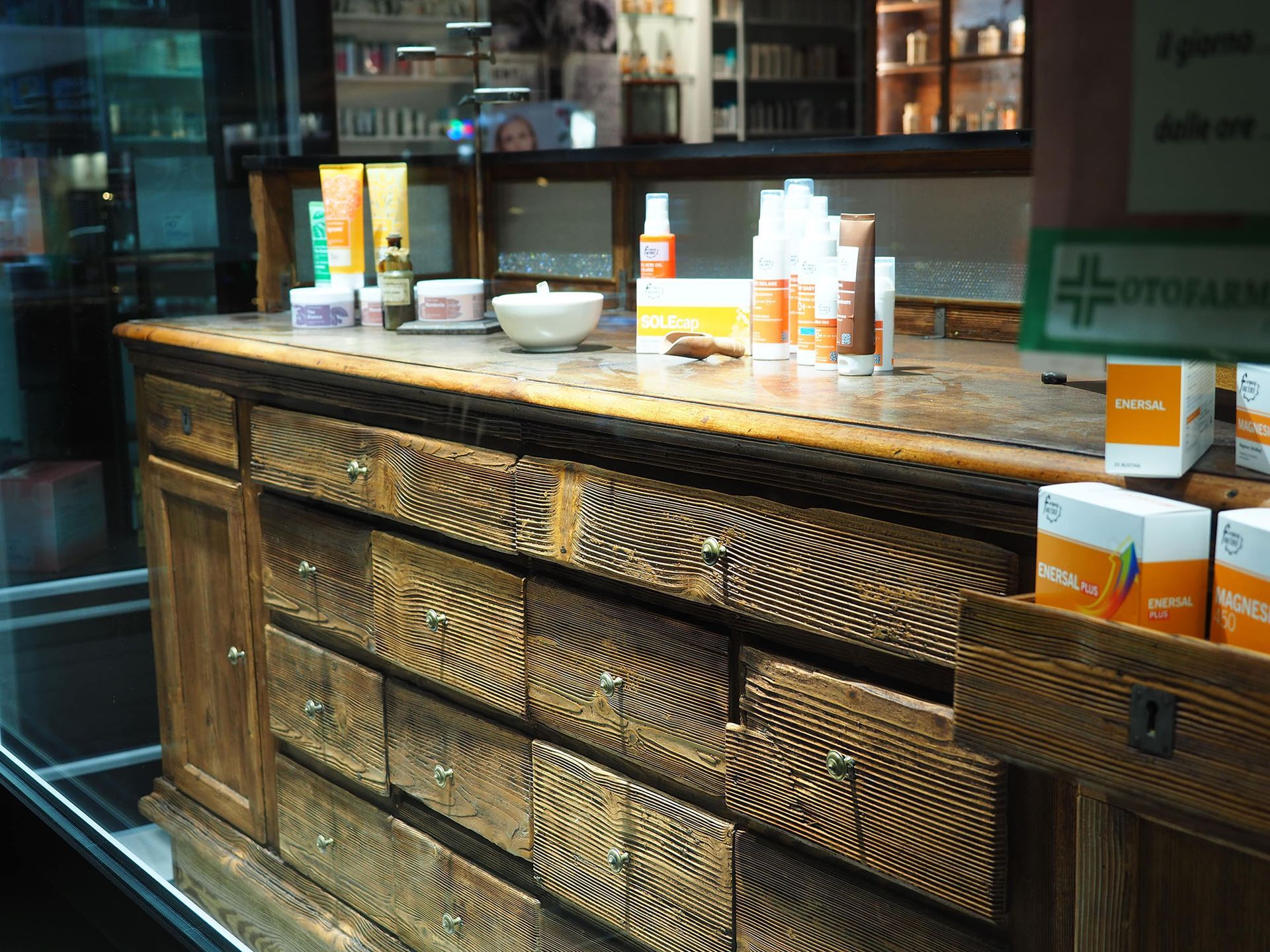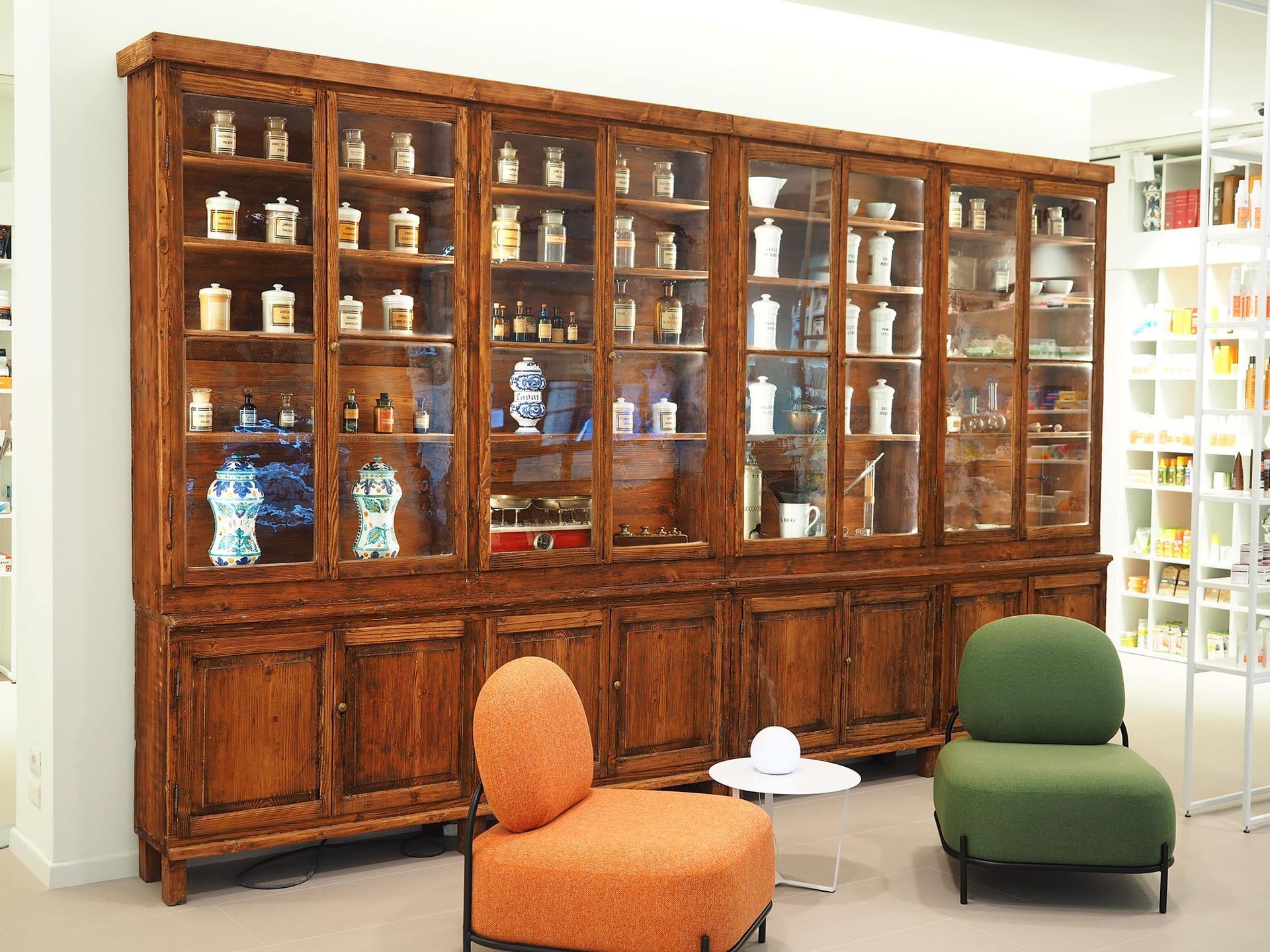 Ampi spazi e arredamento che racconta la storia della farmacia con pezzi storici di fine 800 integrati in un layout moderno e accogliente dove spiccano anche delle sedute per l'attesa, diverse aree per identificare chiaramente i reparti e una moderna sala analisi.